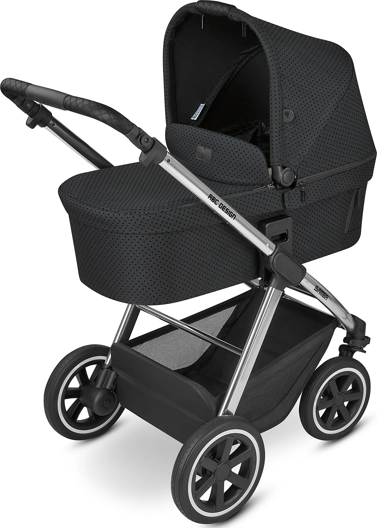 Dank der integrierten ABC Design Universal Fix Halterung finden auch Wickeltasche, Becherhalter oder Licht mit einem Klick ihren Platz am Kinderwagen. Die Bremse befindet sich direkt am rechten Hinterrad, so dass der Wagen ohne Hinterachse auskommt. Dadurch haben Eltern beim Schieben besonders viel Beinfreiheit. Der Wagen lässt sich dank der Schwenkräder leicht lenken und meistert die verschiedensten Untergründe. Die Schieberhöhe ist ebenfalls variabel, so dass ein rückenfreundliches Schieben für unterschiedlich große Personen kein Problem ist.
