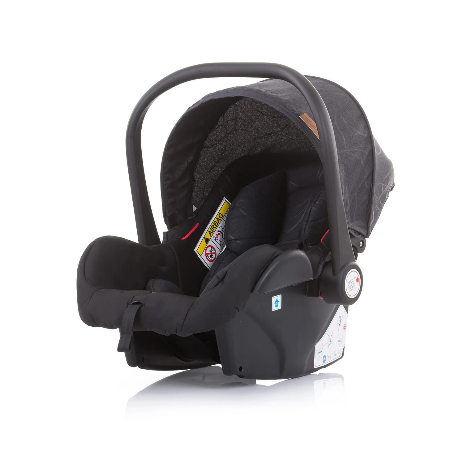 Achtung! Im Auto wird die Babyschale mit 3-Punkt-Gurt auf der Rückbank oder dem Beifahrersitz (bitte Airbag abschalten) entgegen der Fahrtrichtung angeschnallt.