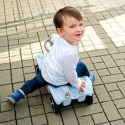 Ein modernes Farbdesign in hellem Blau mit Pusteblumen-Stickern lädt Kinder ab zwölf Monaten zu Ausflügen drinnen und draußen ein. Bobby-Car-Classic Blowball von BIG Hellblau mit Pusteblumen-Stickern griffiges Sicherheitslenkrad mit mechanischer Hupe, Achsschenkellenkung, ergonomische Sitzfläche mit Sicherheits-Kniemulde aus robustem Kunststoff ab 12 Monaten geeignet belastbar bis 50 kg Made in Germany Doch nicht nur im Hinblick auf Design und Extras überzeugt das Rutschfahrzeug. Das BIG-Bobby-Car-Classic ist legendär in seiner Form und unschlagbar in Sachen Qualität. Die seit Jahrzehnten bewährte, unveränderte Karosserie des beliebten Kinderautos ist ergonomisch perfekt auf die Bedürfnisse der kleinen Fahrerinnen und Fahrer abgestimmt. Ein griffiges Sicherheitslenkrad mit mechanischer Hupe, vier robuste und abriebfeste Kunststoffräder, je eine Anhängerkupplung vorn und hinten sowie eine Kniemulde zum Fahren für größere Kinder ergänzen die spielstarke Ausstattung. Für einen kleinen Wendekreis sorgt die stufenlose Achsschenkellenkung des BIG-Bobby-Car. Die hervorragende Verarbeitungsqualität und der tiefliegende Schwerpunkt machen das BIG-Bobby-Car zum besonders sicheren Spielzeug. Das Bobby-Car-Classic Blowball ist aus hochwertigen Materialien im modernen BIG-Werk in Deutschland hergestellt.
