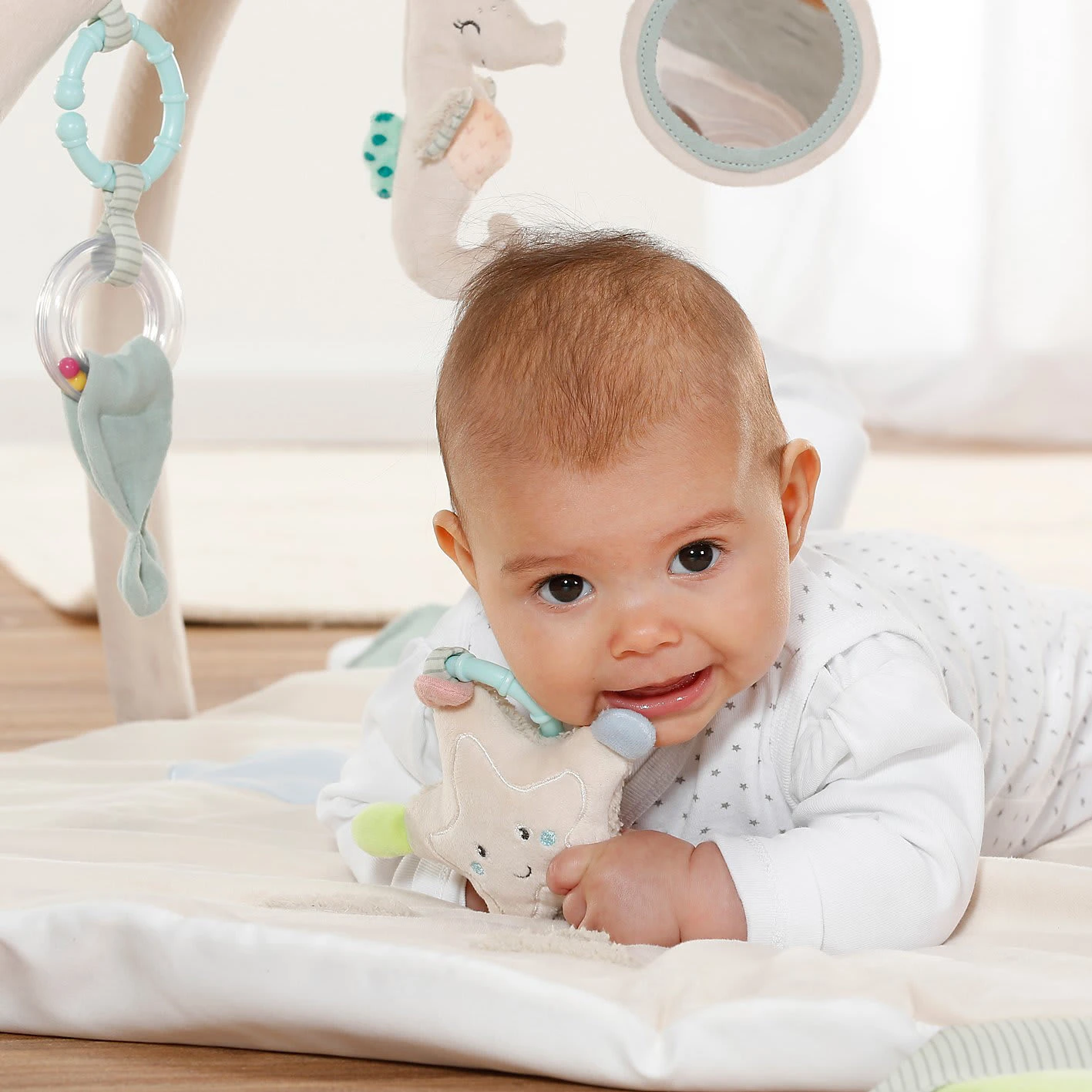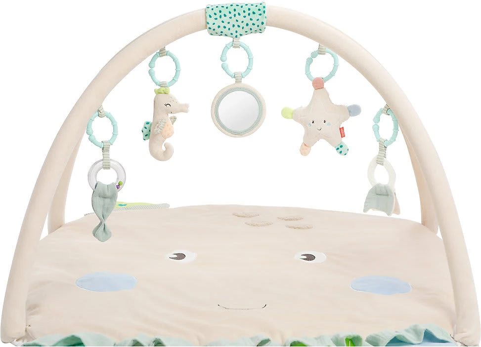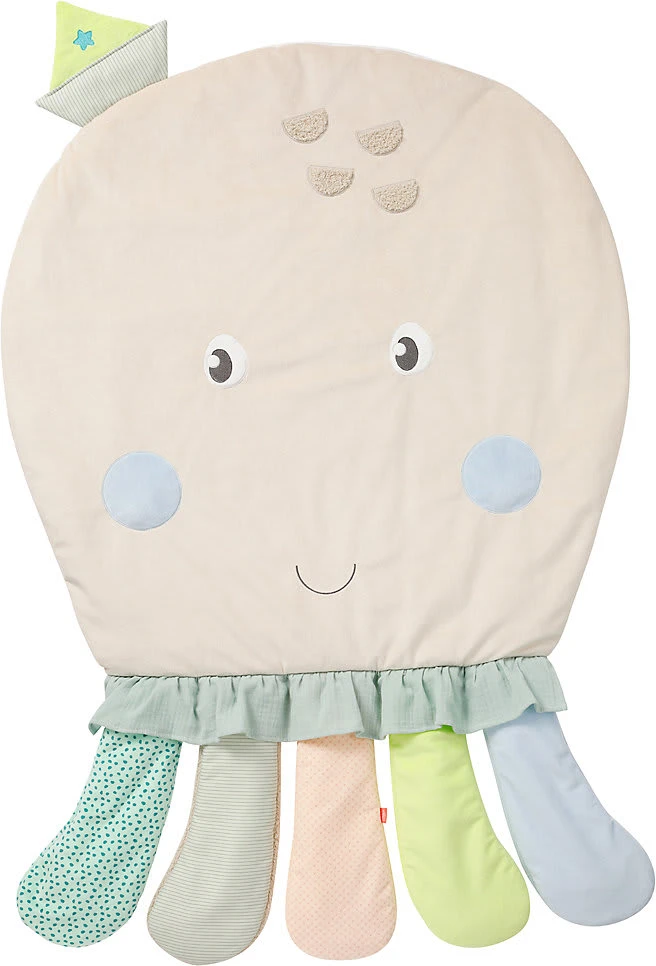 Auf der 3-D-Activitydecke von Fehn können die Kleinen ab Geburt spielerisch ihre Sinne und Motorik trainieren. Spielbogen mit 3-D-Activity-Spieldecke Oktopus von Fehn aus der „Meereskinder“-Kollektion 5 abnehmbaren Spielsachen mit l, Quietscher, Raschelpapier, Spiegel, Softbeißer und Tierstimme 120(L) x 80(B) cm Obermaterial aus Velours, Druckstoff, Musselin und Bouclette ab Geburt geeignet Auf der kuschelweichen Spieldecke in Oktopus-Optik gibt es viel für kleine Meeresfans zu entdecken: Die Decke mit einer Länge von 120 Zentimetern bietet den Kleinen Spielspaß in den verschiedenen Wachstumsphasen – egal ob beim Liegen, Kabbeln oder Sitzen. Die fünf abnehmbaren Spielzeuge mit l, Quietsche, Raschelpapier, Spiegel, Softbeißer und Tierstimme fördern dabei spielerisch Babys Sinne und wecken eine natürliche Neugier zum Greifen, Kuscheln und Spielen.