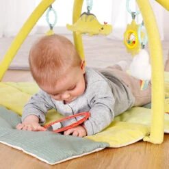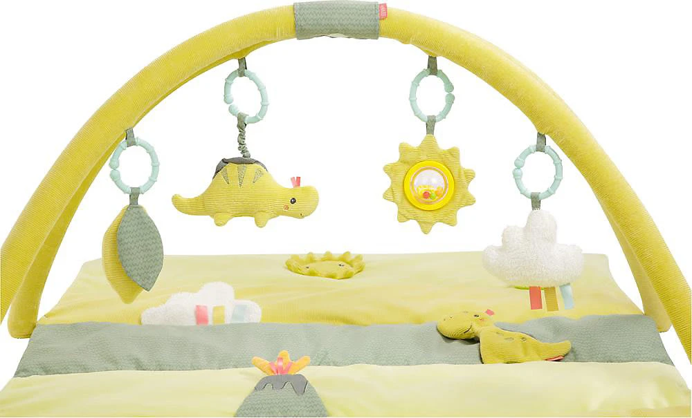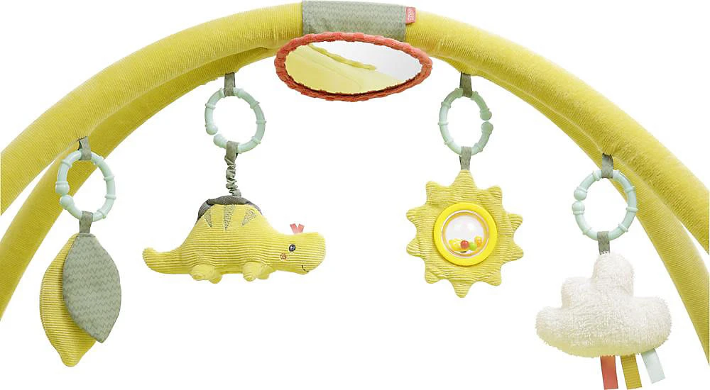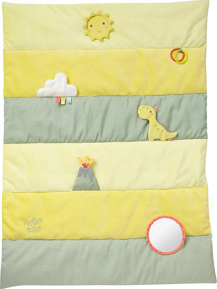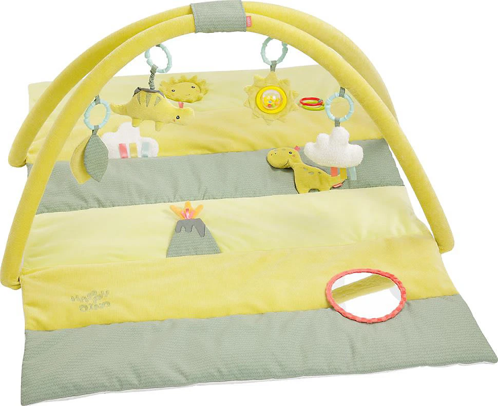 Jede Menge Spielspaß bereitet der Spielbogen mit 3-D-Activity-Decke aus der Happy Dino-Reihe von Fehn. Auf der kuschelig weichen Unterlage lässt es sich anschließend erholsam schlummern und ausruhen. Spielbogen von Fehn mit vier abnehmbaren Spielzeugen und Spieldecke l, Quietsche, Raschelpapier, Glocke, Spiegel, Vibrationsmodul Dinosaurier-Design Cord, Velours und Frottee, waschbar ab Geburt geeignet Der für Kinder ab der Geburt geeignete Spielbogen spricht gleich mehrere Sinne des Babys an. Niedliche Dinos in sanften Farben laden zum Greifen und Knuddeln ein, sodass die Auge-Hand-Koordination und die Feinmotorik trainiert werden. Für akustische Reize sorgen die Glocke, die l und die Quietsche sowie das raschelnde Knisterpapier. Außerdem verfügt das Spielzeug über ein Vibrationsmodul und einen Spiegel, in dem sich das Kind selbst erkennen kann.