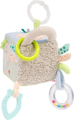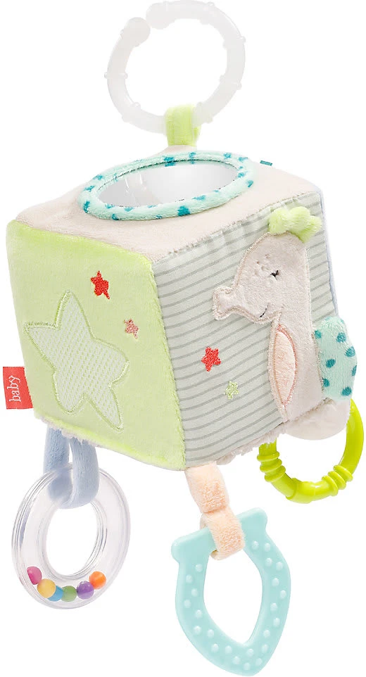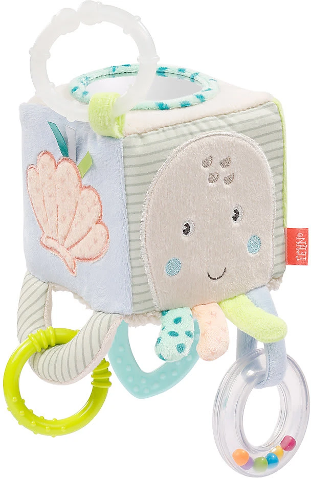 Der spannende Activity-Würfel von Fehn regt spielerisch die Sinne der Kleinen ab Geburt an. Activity-Würfel von Fehn aus der „Meereskinder“-Kollektion mit l, Softbeißer, Raschelpapier, Spiegel, Glöckchen und Greifring Universalring zur Befestigung Obermaterial aus Velours, Jersey, Stoff und Druckstoff ab Geburt geeignet Mit dem spannenden Würfel können Babys spielerisch immer neue Dinge entdecken: Die Perlen-l, das Raschelpapier und das Glöckchen im Inneren machen lustige Geräusche, der kleine Greifring lädt zum Fühlen und Tasten ein, der Softbeißer hilft bei Zahnungsbeschwerden und der Spiegel trainiert spielerisch die Selbsterkennung. Der Activity-Würfel fördert so spielerisch alle Sinne und fördert die Hand-Auge-Koordination der Kleinen. Dank dem praktischen Ring kann der Würfel sicher am Bettchen, Kinderwagen oder der Babyschale befestigt werden.