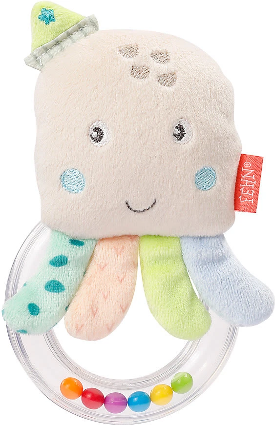 Der meeresstarke lring von Fehn regt spielerisch die Sinne der Kleinen ab Geburt an. lring Oktopus von Fehn aus der „Meereskinder“-Kollektion mit Ringrassel und verborgener Quietsche Obermaterial aus Velours und Druckstoff ab Geburt geeignet Greifen, fühlen, rasseln, quietschen und spielen – mit dem freundlichen Oktopus wird Babys Neugier immer wieder neu geweckt und spielerisch die verschiedenen Sinne trainiert. Die kuschelweichen Materialien und der meeresstarke Look lassen dabei nicht nur die Herzen der Kleinsten höherschlagen.