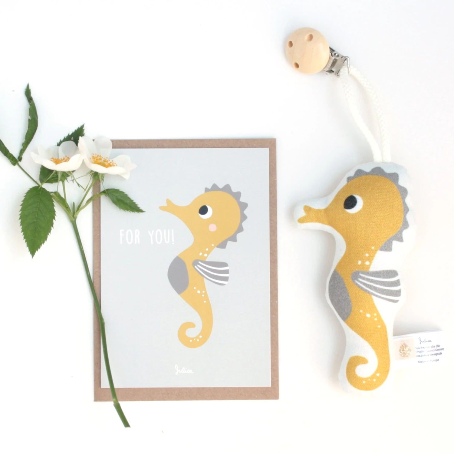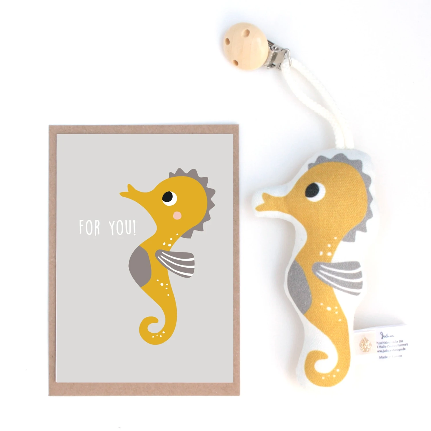 Wo immer der Ausflug hingeht, mit unseren Kinderwagenclips hat das Baby einen vertrauten Gegenstand immer im Blickfeld – auch, wenn der Kopf der Mama mal kurz nicht zu sehen ist. Der süße Clip wird einfach am Verdeck festgeklemmt und sorgt für Geborgenheit und Spaß in Kinderwagen, Babyschale & Co. Sie erhalten den Clip inklusive passender Geschenkkarte ideal zu Geburt oder Taufe.