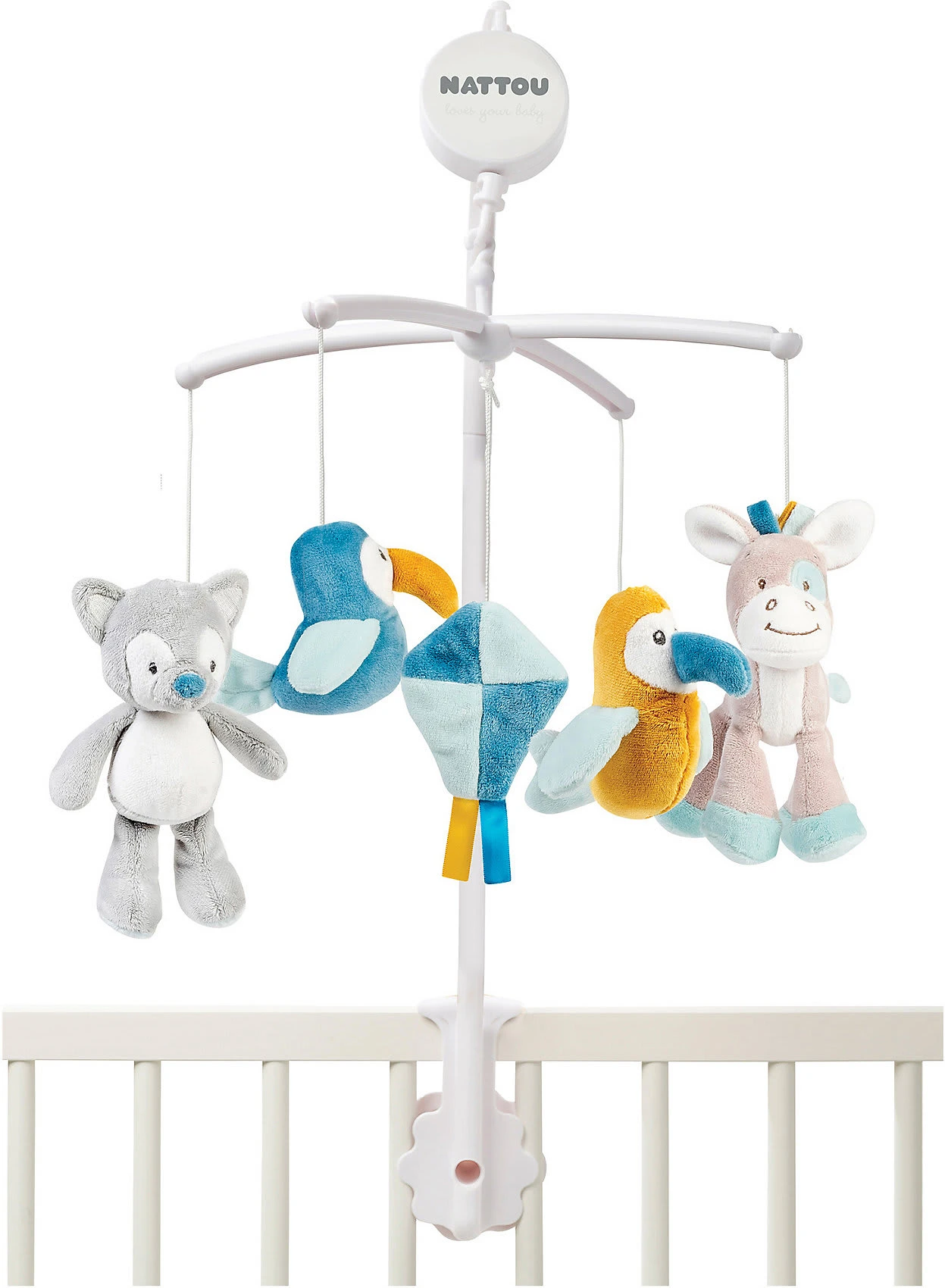 Ein tiefer und sanfter Schlaf ist das wichtigste für Ihr Baby. Mit diesem Mobile von Nattou haben Sie den perfekten Begleiter ins Land der Träume. Liebevoll gestaltet ist das Produkt mit vier süßen Stofftieren ausgestattet, die Baby gerne ein Lächeln auf die Lippen zaubern. Durch beruhigende Rotation und den Einschlafklassiker „LaLeLu“ wird Ihr Liebling schnell zur Ruhe kommen und die müden Äuglein schließen. Die integrierte Halterung erleichtert die Befestigung am Kinderbett.