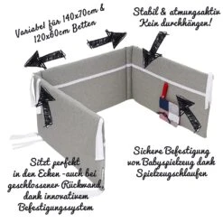 Die Schlaufen links und rechts ermöglichen das sichere Anbringen von Babyspielzeug (0-3 Jahre), Somit hat das Kind immer etwas zu Gucken oder Spielen, wenn es im Bettchen abgelegt wird.