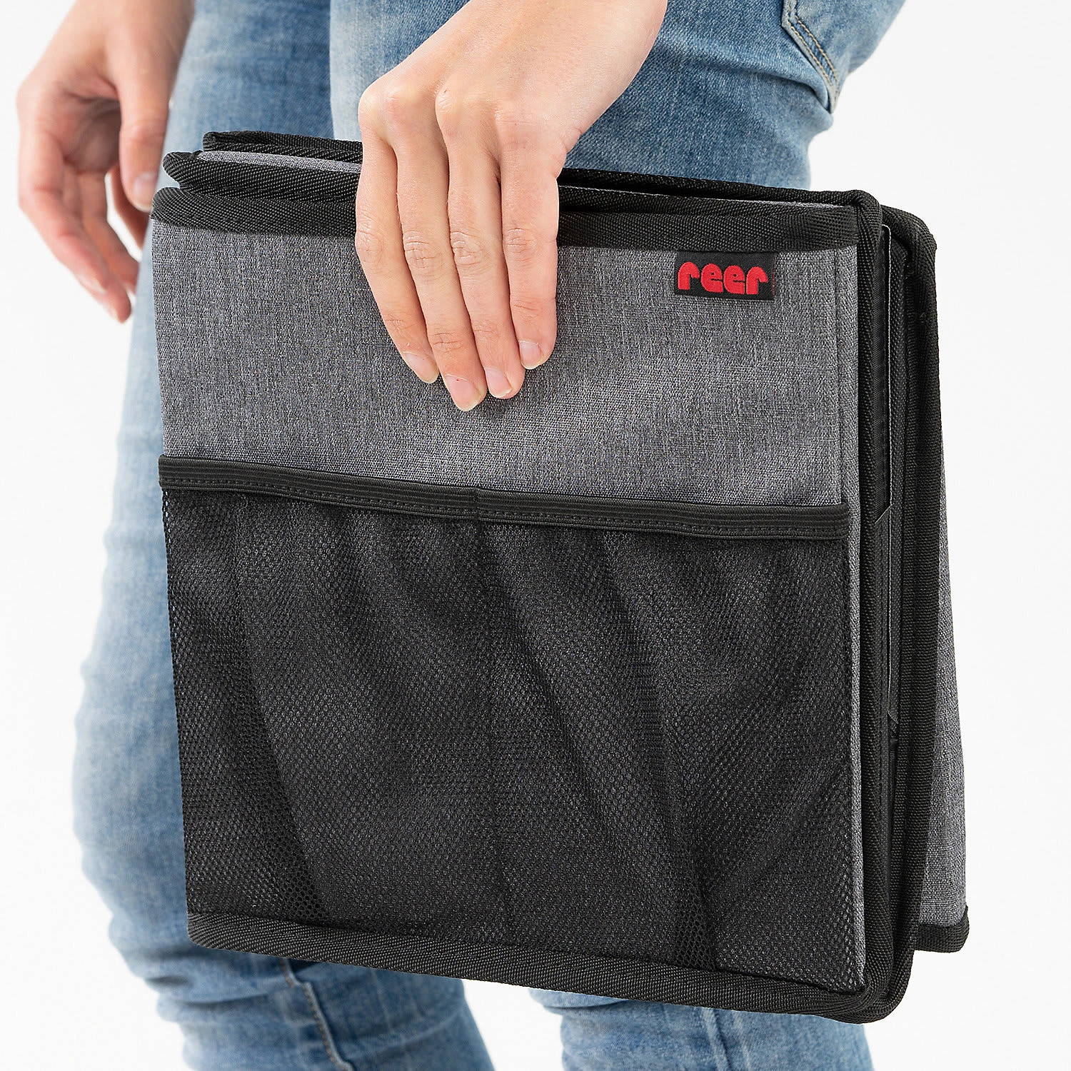 In der TravelKid Auto-Ordnungsbox der Marke REER können diverse Gegenstände wie etwa Getränke, Spielzeug oder Kuscheltiere während der Fahrt griffbereit aufbewahrt werden. Wird die Box nicht gebraucht, kann sie in wenigen Handgriffen zusammengefaltet werden.