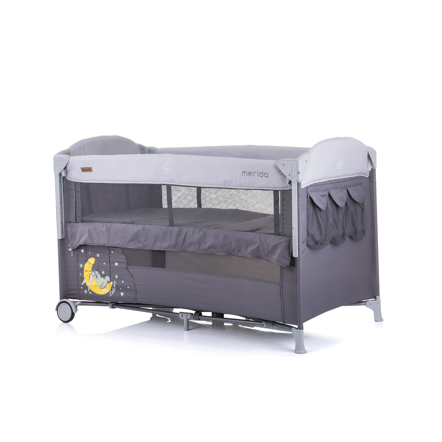Das Reisebett Merida von Chipolino praktisch für unterwegs und zuhause. Beste Sicherheit bieten die Seitenfenster mit dem Blick auf Ihr Kind. Zwei Ebenen stehen zur Verfügung und für ein einfaches Bewegen ist das Reisebett mit zwei Rollen ausgestattet. Ideal als Beistellbettchen geeignet, da sich eine Seite in drei Stufen öffnen lässt. Für das Zubehör sind an einer Außenseite kleine Aufbewahrungstaschen eingearbeitet. Das Kinderreisebett eignet sich ebenfalls ideal als Laufstall.
