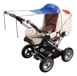 Das Sonnensegel wird mit einem Befestigungsgummi am Verdeck bzw. mit Kordeln am Schieber des Kinderwagens befestigt.